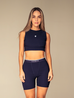 El top tiene un escote semi redondo, fit ceñido y un largo ligeramente cropped que estiliza cualquier look. El biker, inspirado en los clásicos boxers pero con un aire mucho más moderno, tiene un corte al cuerpo, tiro alto y costuras deportivas tipo boyfriend que marcan la diferencia.